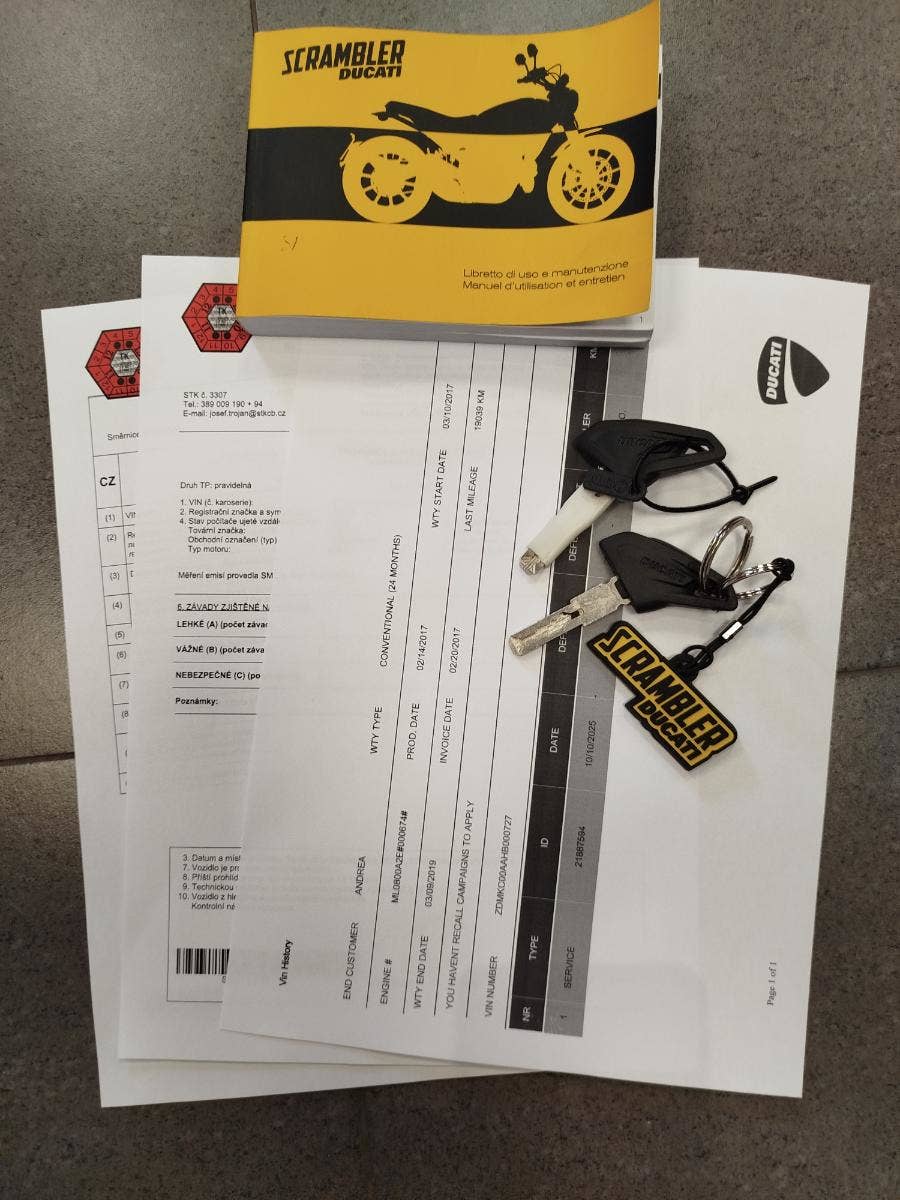 Nabízíme k prodeji moc hezkou Ducati Scrambler Icon 800 z roku 2017 a nájezdem: 19 039 km. Motocykl dovezen z IT v ČR pouze jeden majitel. 2x klíče, uživatelský manuál, elektronický záznam ze servisní knihy. Motorka nyní čerstvě po velkém servisu u nás v autorizovaném dealerství Ducati. Desmo servis konkrétně: výměna řemenů, kontrola ventilových vůlí, nové svíčky. Dále nová baterka, čerstvá STK, výměna oleje, olejového filtru. Spousta doplňků: komfortní sedlo, ukazatel zařazené rychlosti, stavitelné páčky Ducati Performance, CNC víčka rozvodů (otevřené provedení). K motorce: cestovní plexi, stavitelné páčky, origo sedlo, kryty rozvodů, nosič včetně tašky a taška na nádrž. Motorka ve 100% stavu, prověřená a připravená na nového majitele.