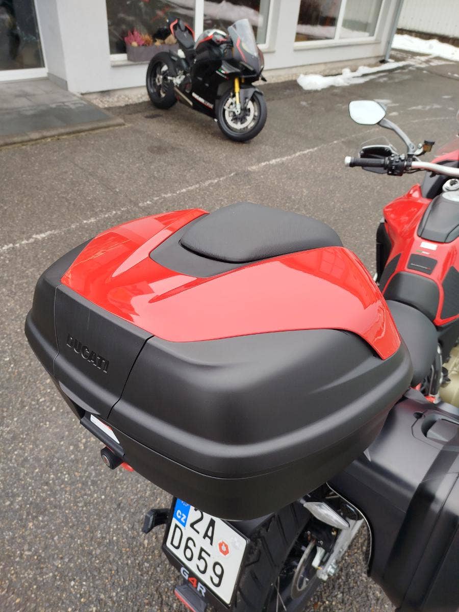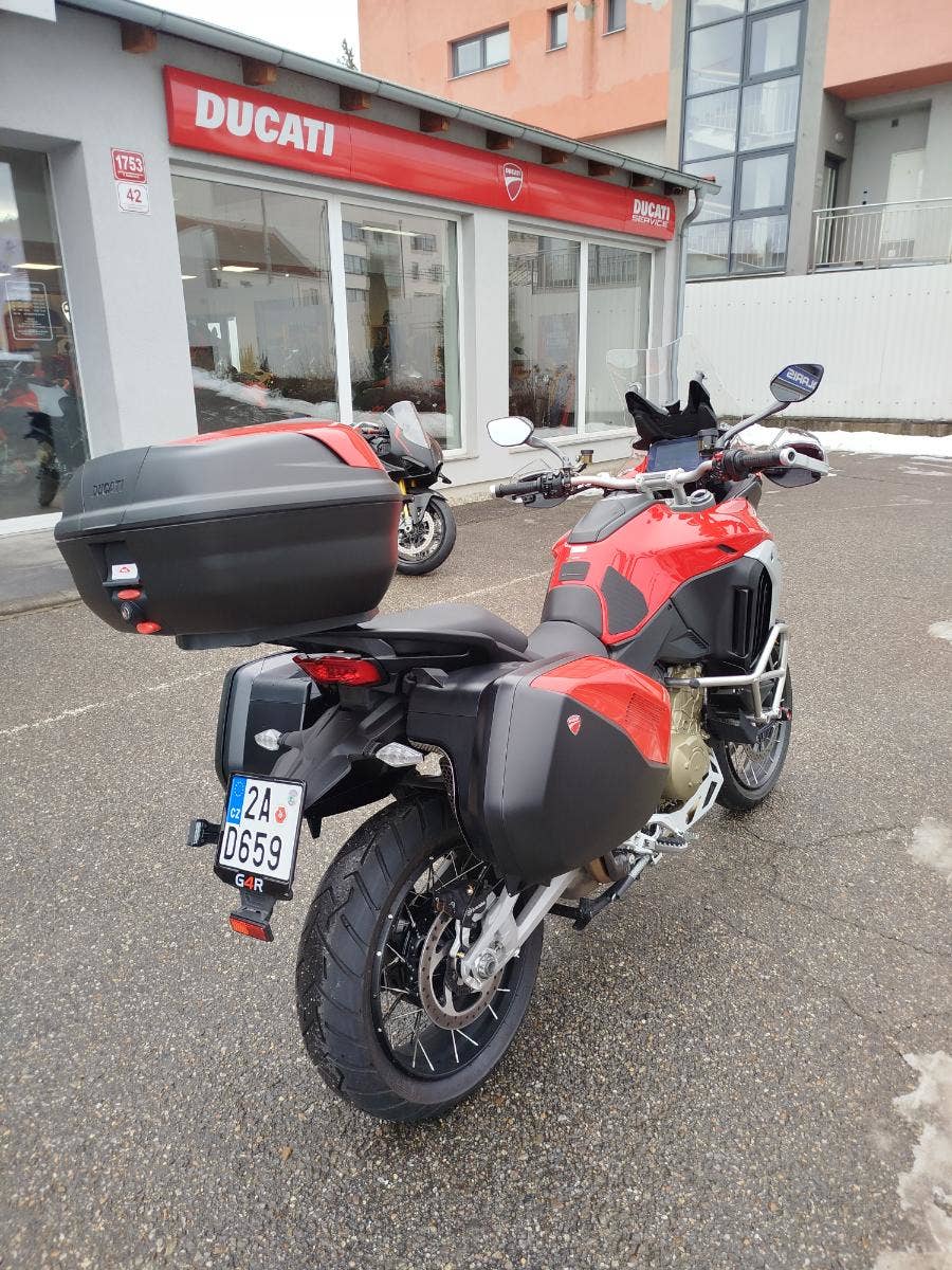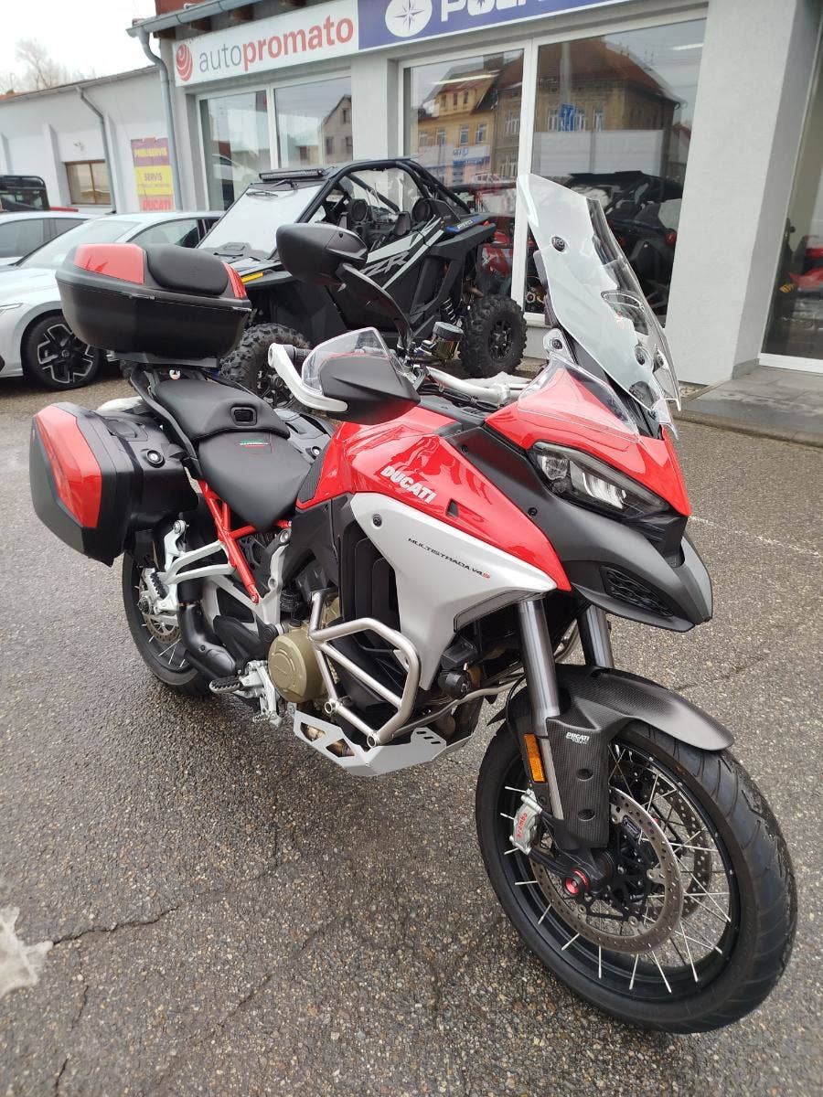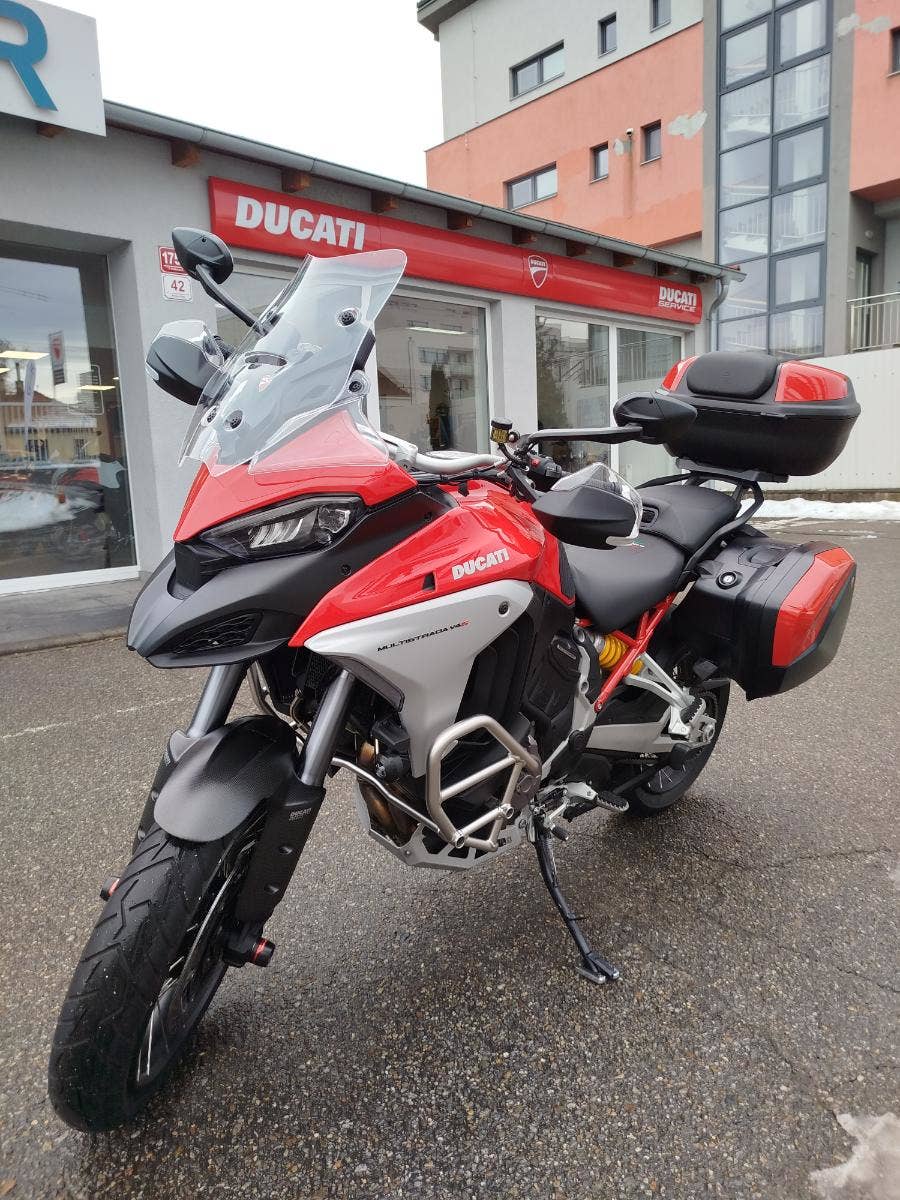 Nabízíme k prodeji prakticky novou Ducati Multistrada V4S ve verzi Full z roku 2022 a nájezdem pouhých: 3 677 km. Motorka zakoupena jako nová v ČR v autorizovaném dealerství Ducati. Pouze jeden majitel, 2x klíče, uživatelský manuál, elektronický výpis ze servisní knihy, stále v tovární záruce. Pravidelný garanční servis pouze v autorizovaném dealerství Ducati, rádi doložíme. Nyní čerstvě po garanční prohlídce u nás rovněž v autorizovaném prostřední. Motorka 100% připravená na jaro. Totálně nabitá výbava čítající: samozřejmě elektronický podvozek, drátěná kola, přední + zadní radar včetně hlídaní mrtvých úhlů, sada bočních kufrů včetně vnitřních tašek, sadu horního kufru, handsfree víčko nádrže, hlavní stojan, vyhřívané rukojeti, vyhřívané obě sedadla, mřížka olejového chladiče, slidery osy kol, boční tankpad nádrže, kryt pod motorem, padací rám, mlhovky, kryty rukojetí, karbonový přední blatník, koncovka Akrapovič. Vše v perfektním stavu. Boční kufry jsou úplně nové nejeté stejně tak tašky uvnitř. Nádherná prakticky nová motorka s českým původem a nadstandardní výbavou za celkovou exkluzivní cenu.
