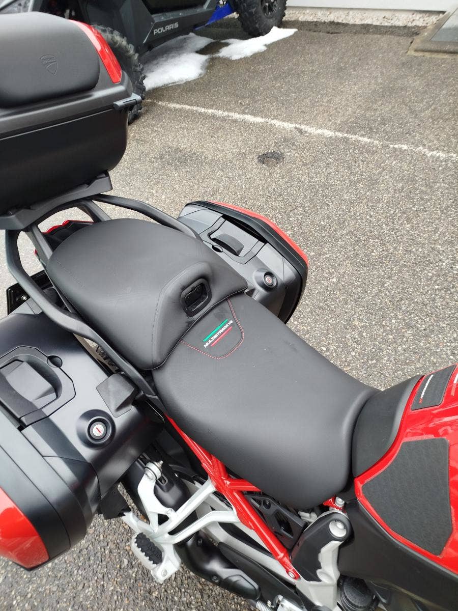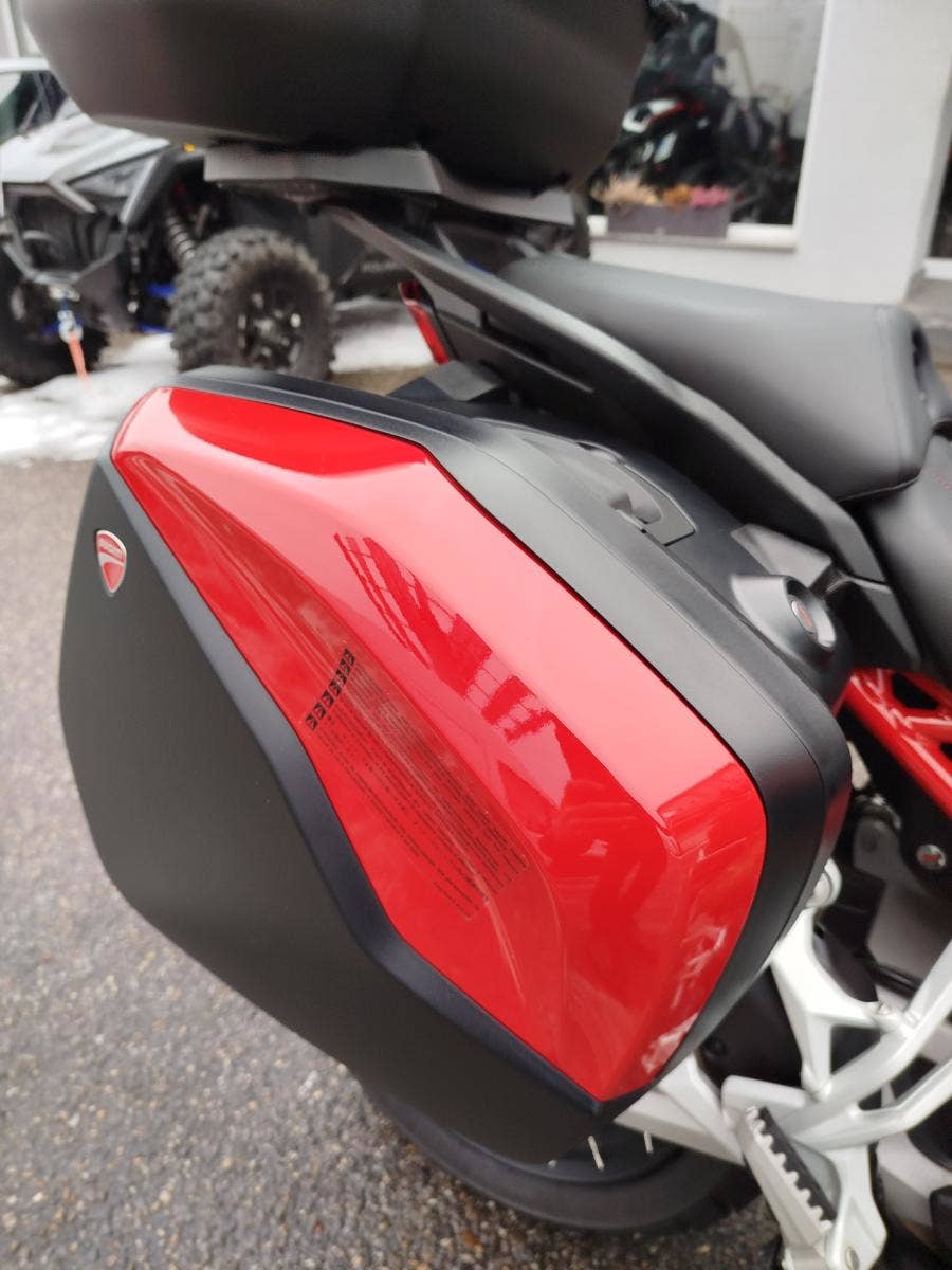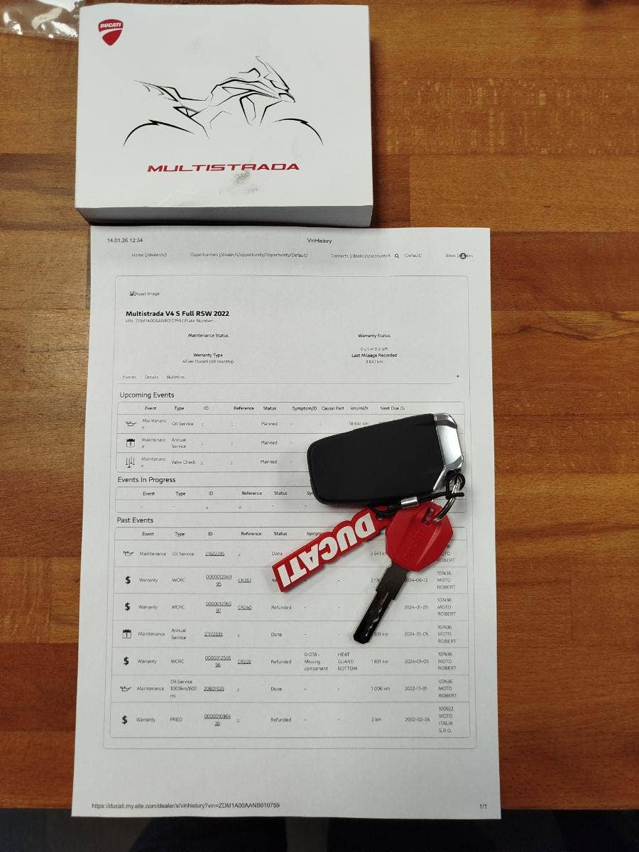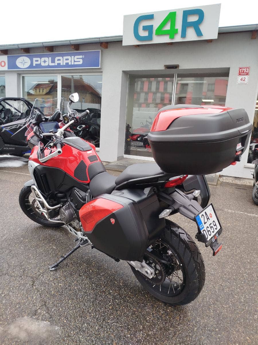 Nabízíme k prodeji prakticky novou Ducati Multistrada V4S ve verzi Full z roku 2022 a nájezdem pouhých: 3 677 km. Motorka zakoupena jako nová v ČR v autorizovaném dealerství Ducati. Pouze jeden majitel, 2x klíče, uživatelský manuál, elektronický výpis ze servisní knihy, stále v tovární záruce. Pravidelný garanční servis pouze v autorizovaném dealerství Ducati, rádi doložíme. Nyní čerstvě po garanční prohlídce u nás rovněž v autorizovaném prostřední. Motorka 100% připravená na jaro. Totálně nabitá výbava čítající: samozřejmě elektronický podvozek, drátěná kola, přední + zadní radar včetně hlídaní mrtvých úhlů, sada bočních kufrů včetně vnitřních tašek, sadu horního kufru, handsfree víčko nádrže, hlavní stojan, vyhřívané rukojeti, vyhřívané obě sedadla, mřížka olejového chladiče, slidery osy kol, boční tankpad nádrže, kryt pod motorem, padací rám, mlhovky, kryty rukojetí, karbonový přední blatník, koncovka Akrapovič. Vše v perfektním stavu. Boční kufry jsou úplně nové nejeté stejně tak tašky uvnitř. Nádherná prakticky nová motorka s českým původem a nadstandardní výbavou za celkovou exkluzivní cenu.