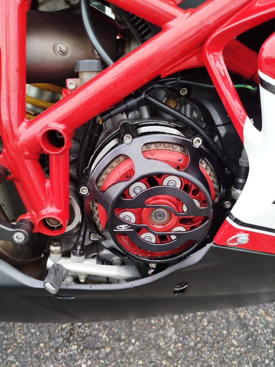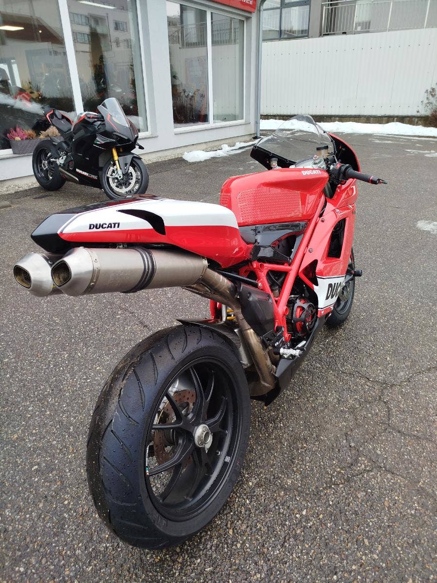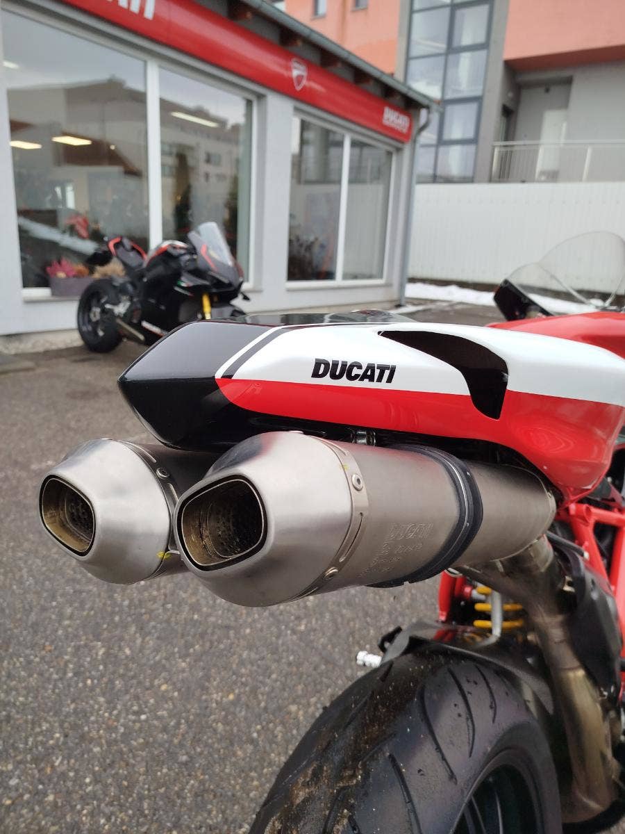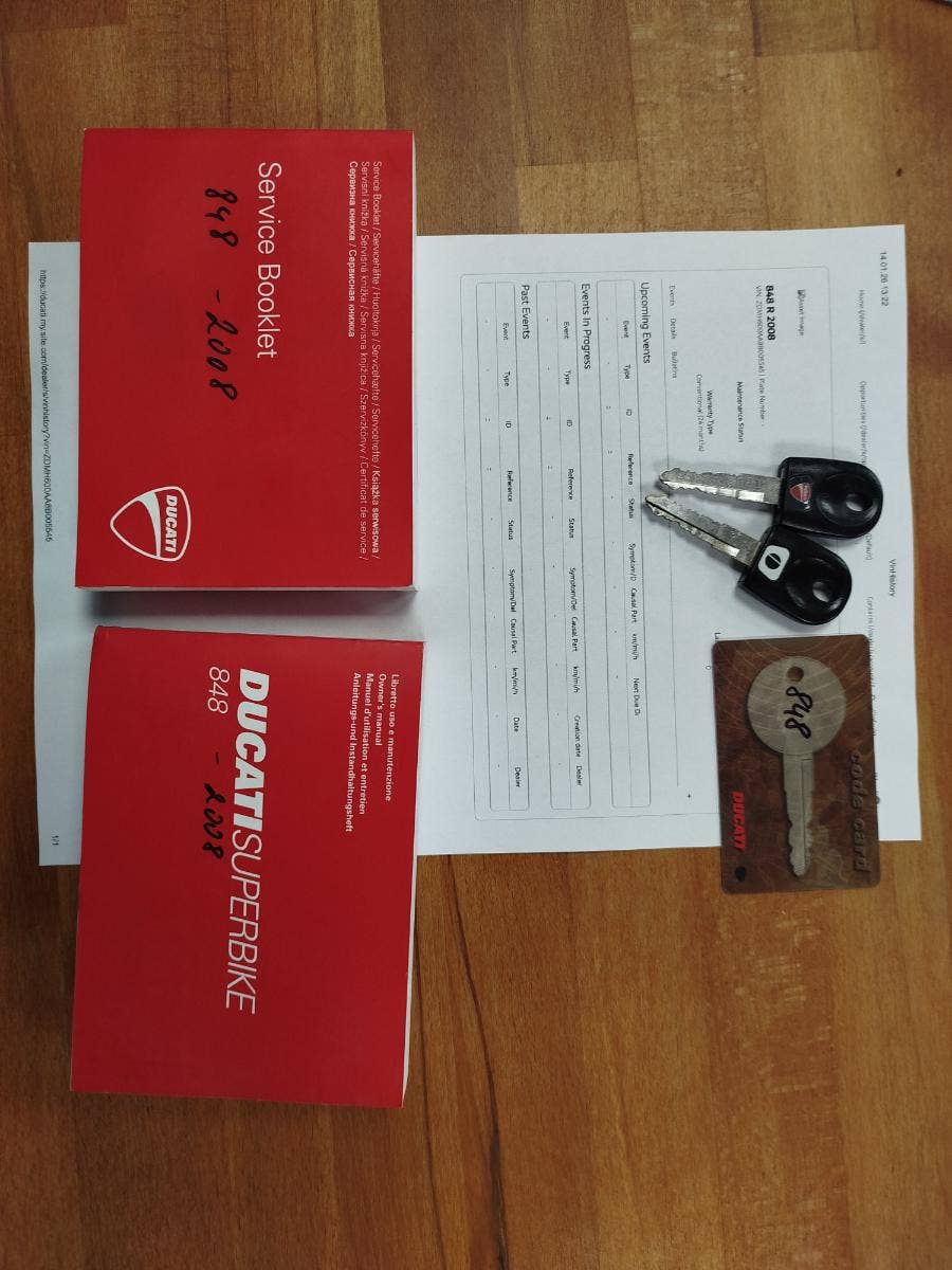 Nabízíme k prodeji krásnou Ducati 848 z roku 2008 a nájezdem 11 353 km převlečenou do kapot. Motorka zakoupená jako nová v ČR v autorizovaném dealerství Ducati. Nyní druhý majitel, 2x klíče, kodovací karta, uživatelský manuál, servisní kniha, elektronický záznam. Pravidelný garanční servis pouze v autorizovaním prostředí, rádi doložíme. Nyní čerstvě po garanční prohlídce u nás. Výměna oleje, olejového filtru, diagnostika, nová baterie. Od desmo servisu najeto cca 500 km. Motorka poskládaná na krásných neporušených kapotách. K dispozici samozřejmě původní kapotáž včetně světel blinkrů v neporušeném stavu dobře zabalené. Bohatá nadstandardní výbava čítající: tlumič řízení, quikshifter, stavitelné páčky, rychlopal Domino, kryty páček, stavitelné přepákování, otevřená spojka. K motorce 3x krabice dílů. Vše je v moc hezkém stavu a lze snadno přeskládat do původního stavu.